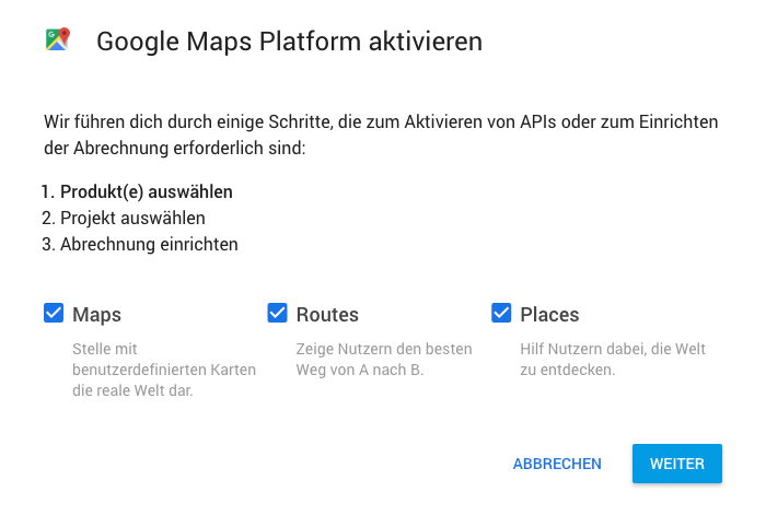 In meinem Fall habe ich alle ausgewählt, da ich für meine Arbeit alle Produkte der Google Maps Api benötige.